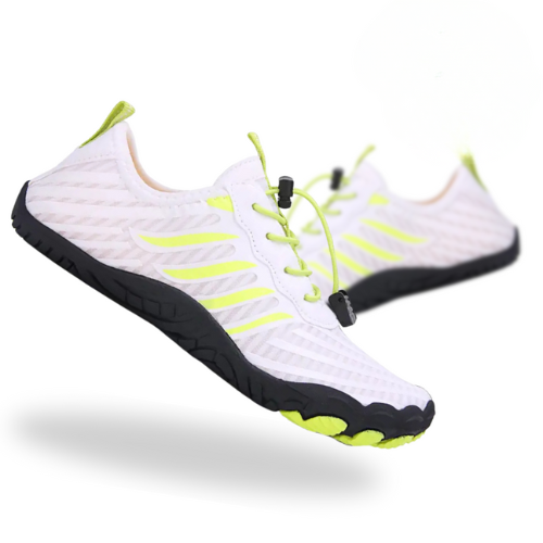 Den breda tåboxen låter tårna sprida ut sig och lindrar tryck, hallux valgus, nageltrång och stickningar vid neuropati. Den tunna, flexibla och halksäkra sulan ger markkänsla, bättre balans och kan avlasta hälvärk/plantar fasciit även under långa arbetspass. Skorna andas och torkar snabbt för bekvämare vardag.